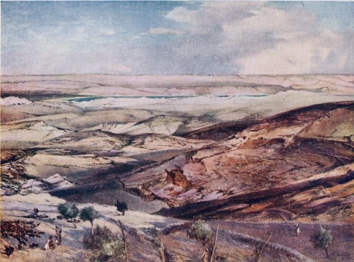 The colours are manifold, and they vary considerably with the seasons of the year. Yet the bare hill-sides{8} (which form the greater masses of colour in most landscapes), the desert, and the distant mountain ranges, are ever the same. Most travellers make their first acquaintance with Palestine in Judea, entering it from Jaffa. When the plains are behind you, and you are in among the valleys up which the road climbs to Jerusalem, you at once recognise the fact that a new and surprising world of colour has been entered. In the valley-bottom there may be but a dry watercourse, or perhaps a rusty strip of cultivated land; but above you there is sure to be the outcrop of white and grey limestone. In some places it appears in characterless and irregular blotches whose grotesque intrusion seems to confuse and caricature the mountain side. This is, however, only occasional, and the usual and characteristic appearance is that of long and flowing lines of striation which generally follow pretty closely the curve of the sky-line. The colours of these strata are many. You have rich brown bands, dark red, purple, yellow, and black ones; but these are toned down by the dominant grey of the broader bands, and the general effect is an indistinct grey with a bluish tinge, to which the coloured bands give a curiously artificial and decorative appearance. As a work of Art Judea is most interesting; as part of Nature it is almost incredible.
