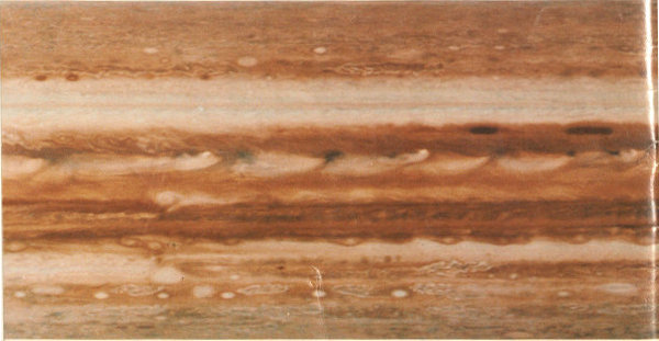 Jupiter’s Equatorial Zone is the broad, orange band that traverses the center of this Voyager 2 picture. This zone is characterized by the wispy clouds along its northern edge. The brown oval was observed by Voyager 1 four months earlier, illustrating the stability of this type of feature in the Jovian atmosphere. In contrast, the turbulent region in the lower right of the picture, which lies just to the left of the Great Red Spot, shows features that are relatively short lived. With the exception of the cooler Great Red Spot, as colors range from white to orange to brown, we are generally looking at deeper and warmer layers in the Jovian atmosphere.