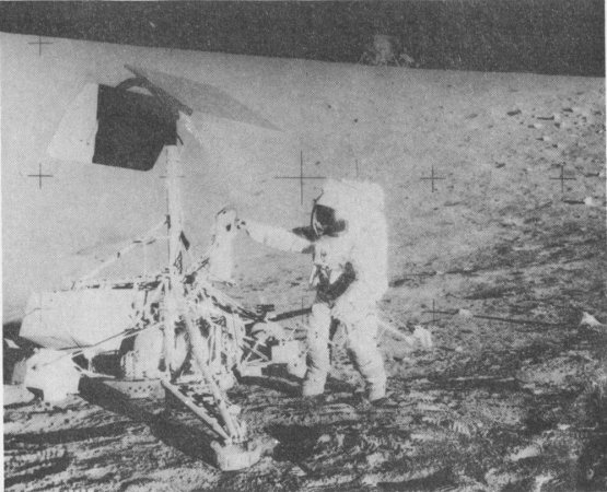 An Apollo 12 astronaut retrieves Surveyor 3 hardware for Earth laboratory analysis after 30 months exposure on lunar surface.