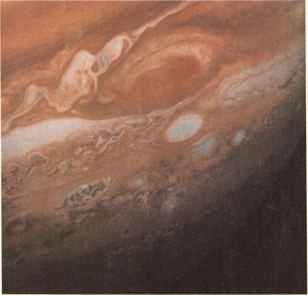 A comparison of the Voyager 2 photograph above with the preceding Voyager 1 photograph shows several distinct changes in the Jovian atmosphere around the Great Red Spot. The white oval beneath the Great Red Spot in the first picture has moved farther around Jupiter, and a different white oval has appeared under the Great Red Spot in the Voyager 2 picture taken four months later. The disturbed cloud regions around the Great Red Spot have noticeably changed, and the white zone west of the Great Red Spot has narrowed.