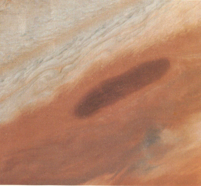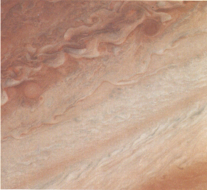 The Great Red Spot on Jupiter is a tremendous atmospheric storm, twice the size of Earth, that has been observed for centuries. The Great Red Spot rotates counterclockwise with one revolution every six days. Wind currents on the top flow east to west, and currents on the bottom flow west to east. This Voyager 1 picture shows the complex flow and turbulent patterns that result from the Great Red Spot’s interactions with these flows. The large white oval is a similar, but smaller, storm center that has existed for about 40 years.