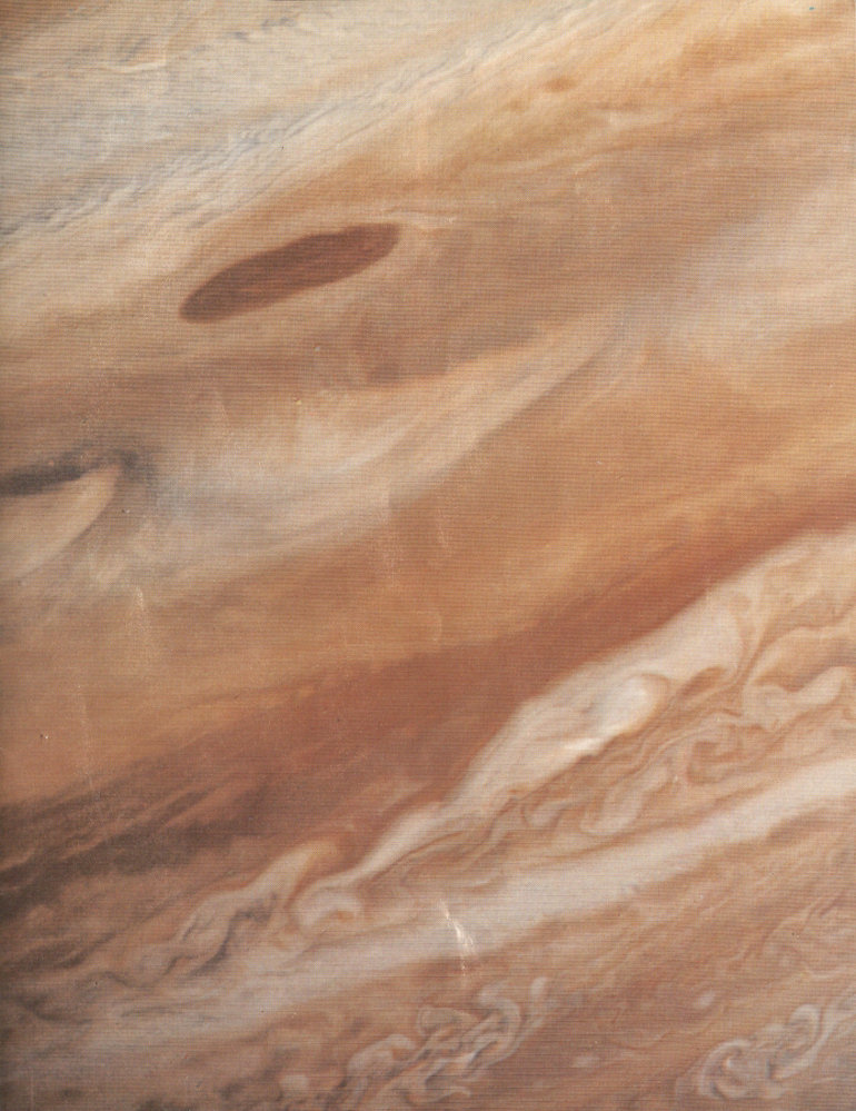 The large brown-colored oval appearing in this Voyager 1 picture was selected as one of the targets to be photographed near closest approach to Jupiter because it is probably an opening in the upper cloud deck that exposes deeper, warmer cloud levels. Brown ovals (which can also be seen in the preceding and following photographs) are common features in Jupiter’s northern latitudes and have an average lifetime of one to two years.