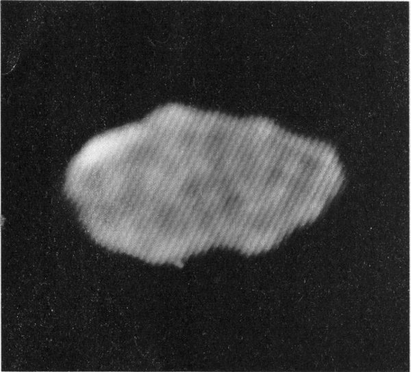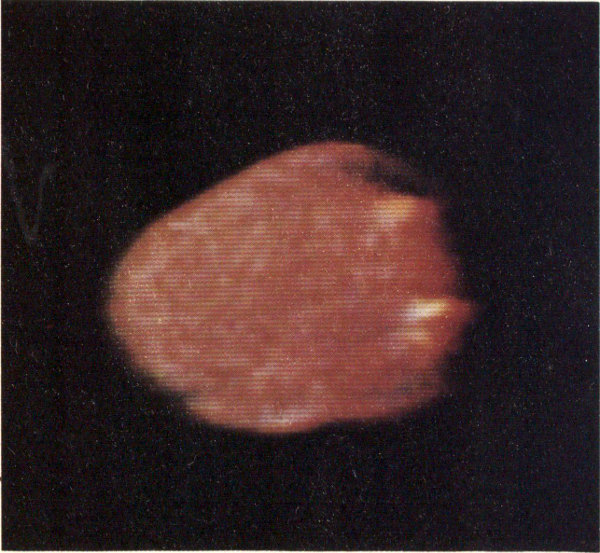 Amalthea was observed end-on in the Voyager 2 picture, which has been computer-processed to enhance the image.