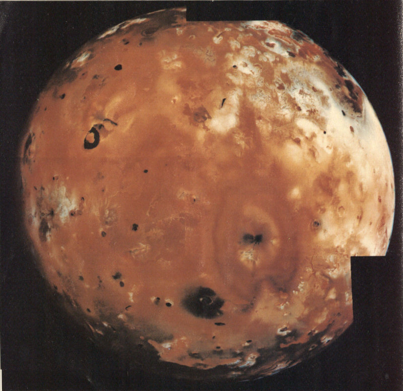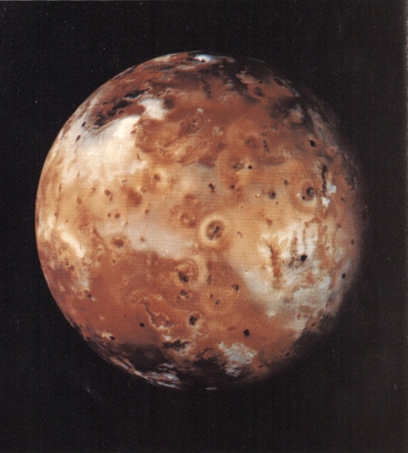 Io’s surface, less than ten million years old, is quite young compared to the other Galilean satellites and to other terrestrial bodies, such as Mercury and the Moon. The surface is composed of large amounts of sulfur and sulfur dioxide frost, both of which account for most of the surface color. This picture was taken by Voyager 1. Material deposited by the volcano (see following pictures) can be seen as a white ring near the center of Io.