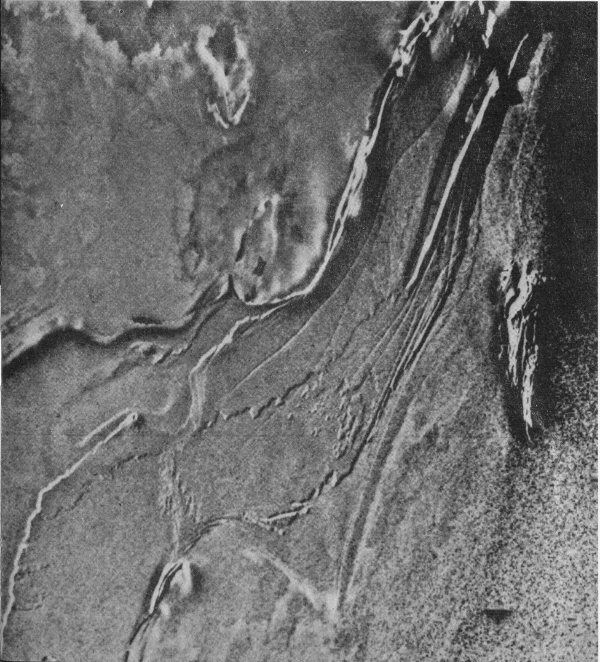 High-speed wind currents in the mid-latitudes of Jupiter are shown in this high-resolution Voyager 1 photograph. The pale orange line running diagonally to the upper right is the high-speed north temperate current with a wind speed of about 120 meters per second (260 miles per hour), over twice as fast as severe hurricane winds on Earth. Toward the top of the picture, a weaker jet of approximately 30 meters per second (65 miles per hour) is characterized by wave patterns and cloud features that rotate in a clockwise manner.