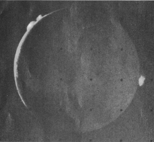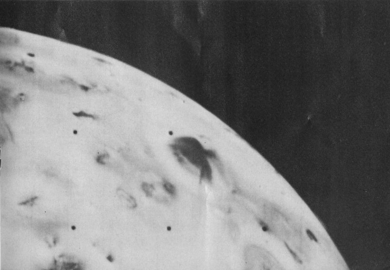 Of the eight active volcanoes discovered on Io by Voyager 1, six of the seven volcanoes sighted by Voyager 2 were still active. The giant volcano observed by Voyager 1 over the “hoofprint” region (see page 18) had become inactive. Scientists, therefore, believe that the satellite is undergoing continuous volcanic activity, making Io’s surface the most active in the solar system. This Voyager 2 photograph, which shows three active volcanoes, was one of the last of an extensive sequence of “volcano watch” pictures planned as a result of Voyager 1’s volcano discovery. The black dots are calibration points on the camera.