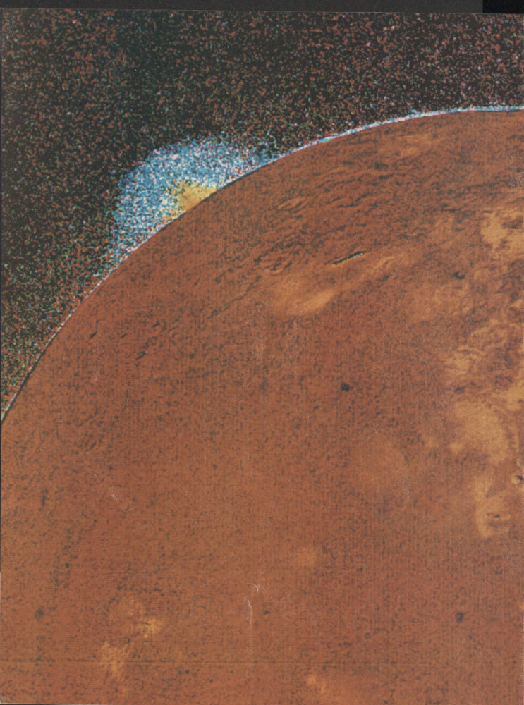 Special color reconstruction by means of ultraviolet, blue, green, and orange filters allowed scientists to study the amount of gas and dust and the size of the dust particles that erupted from the volcano on Io shown in this Voyager 1 image. The region that is brighter in the ultraviolet (blue area) is about 210 kilometers (130 miles) high, over twice the height of the denser, bright yellow core. The vent area is visible on page 18 as a dark ring in the upper left region of Io.