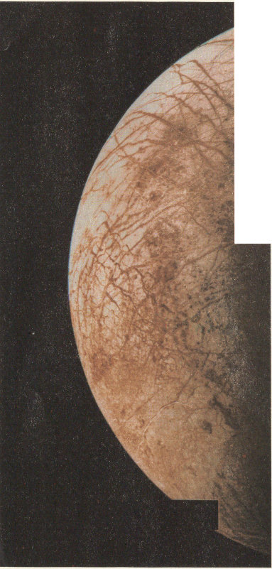 Europa’s surface is probably a thin ice crust overlying water or softer ice (slush) about 100 kilometers (60 miles) thick that covers a silicate interior. The tectonic processes on Europa’s surface create patterns that are drastically different from the fault systems seen on Ganymede’s surface, where pieces of the crust have moved relative to each other. On Europa, the crust evidently fractures, but the pieces remain roughly in their original position. This Voyager 2 picture is composed of three images.