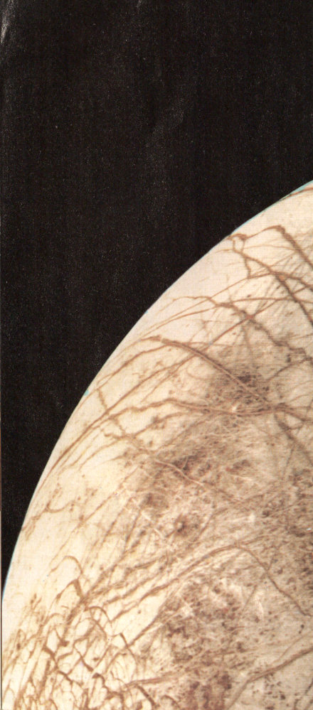 Complex narrow ridges, seen as curved bright streaks 5 to 10 kilometers (3 to 6 miles) wide and typically 100 kilometers (60 miles) long, characterize the surface topography of this view of Europa. The dark bands also visible in this Voyager 2 photo are 20 to 40 kilometers (12 to 25 miles) wide and up to thousands of kilometers long. The fractures on the icy surface are filled with material from beneath, probably as a result of internal tidal flexing which continually heats the thin outer ice crust. A few features are suggestive of degraded impact craters.