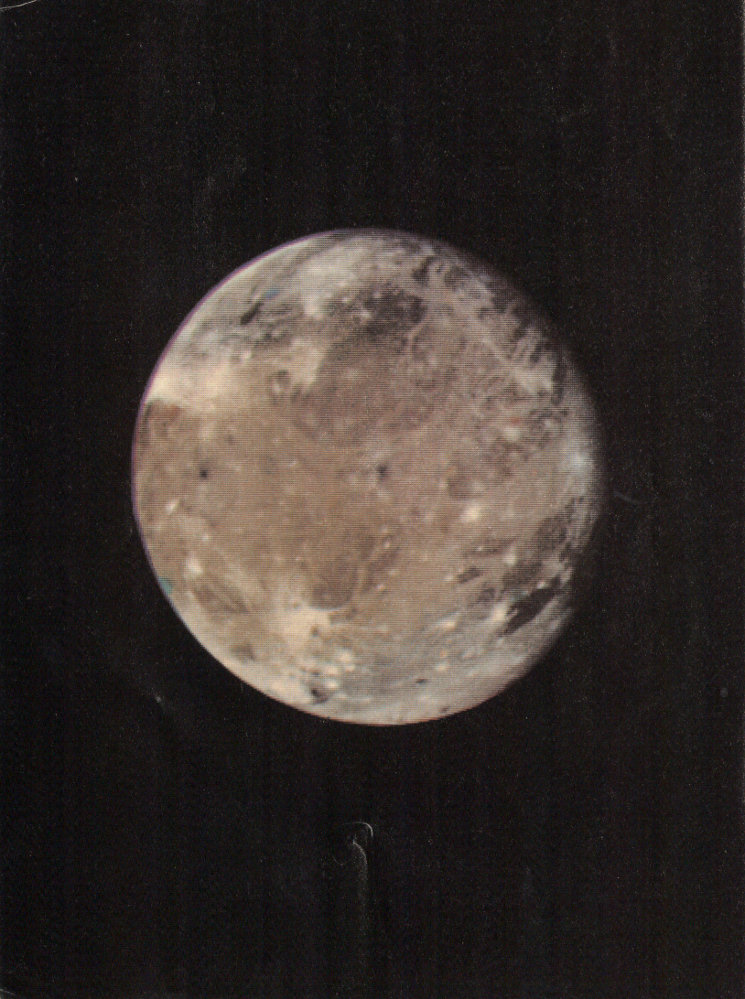 Ganymede, Jupiter’s largest satellite, is about one and one-half times the size of our Moon but only about half as dense and is composed of about 50 percent water or ice and the rest rock. The bright surface of Ganymede is a complex montage of ancient, relatively dark and cratered terrain, grooved terrain that resulted from a dramatic history of tectonic movement in the icy crust, and bright young ray craters that expose fresh ice. This photograph was taken by Voyager 1.