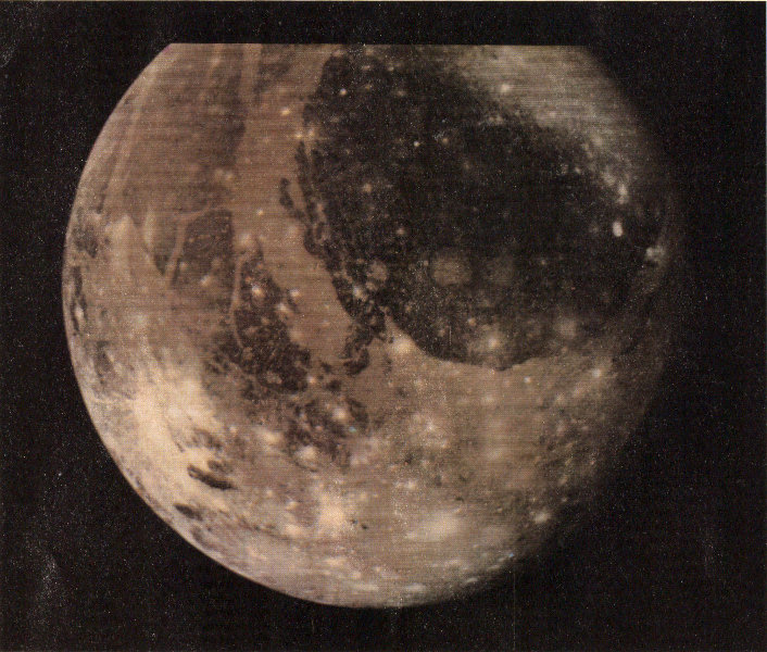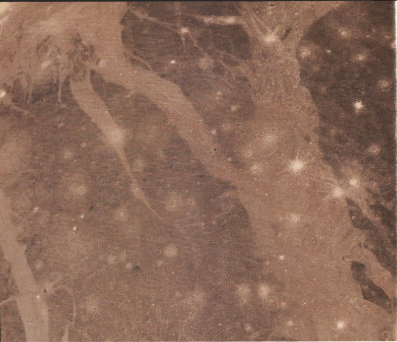 The dark, cratered, circular feature in this Voyager 2 photograph is about 3200 kilometers (2000 miles) in diameter and is on the side of Ganymede opposite to that shown in the previous picture. This region is apparently the largest piece of ancient, heavily cratered crust left on Ganymede. The light branching bands are ridged and grooved terrain which are younger than the more heavily cratered dark regions. Despite the dramatic surface appearance, Ganymede is relatively devoid of topographic relief due to the consequences of glacier-like “creep” in the icy crust.