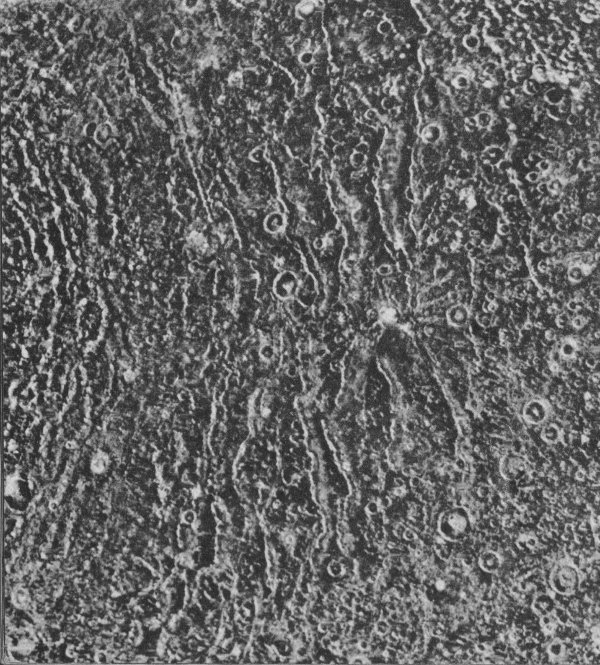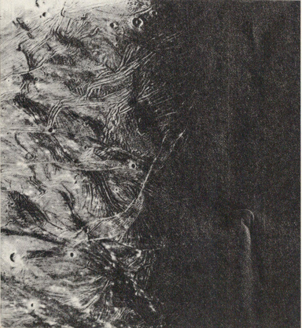 This high-resolution image of Callisto, photographed by Voyager 1, shows details of the large ring structure surrounding the remains of the ancient impact basin visible on page 35. The surface area shown in this image is at the right edge and slightly above the center of the picture on page 35. The relatively undisturbed region on the right shows the shoulder-to-shoulder large impact craters typical of most of Callisto’s surface. A decrease in crater density toward the center of the structure (to the left) is evident, and is caused by the destruction of very old craters by the large impact that formed the ring