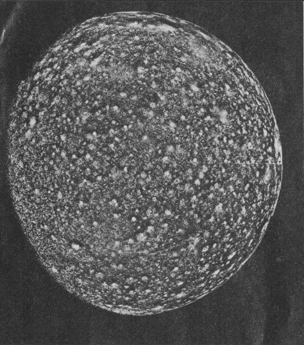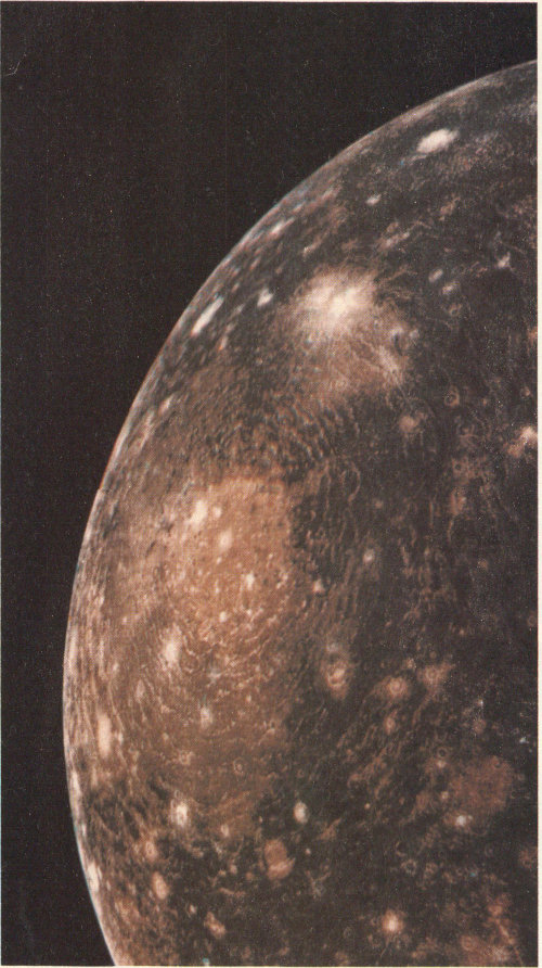 Callisto, only slightly smaller than Ganymede, has the lowest density of all the Galilean satellites, implying that it has large amounts of water in its bulk composition. Its surface is darker than the other Galilean satellites, although it is still twice as bright as our Moon. This Voyager 2 image shows Callisto to have the most heavily cratered and, therefore, the oldest surface of the Galilean satellites, probably dating back to the period of heavy meteoritic bombardment ending about four billion years ago.
