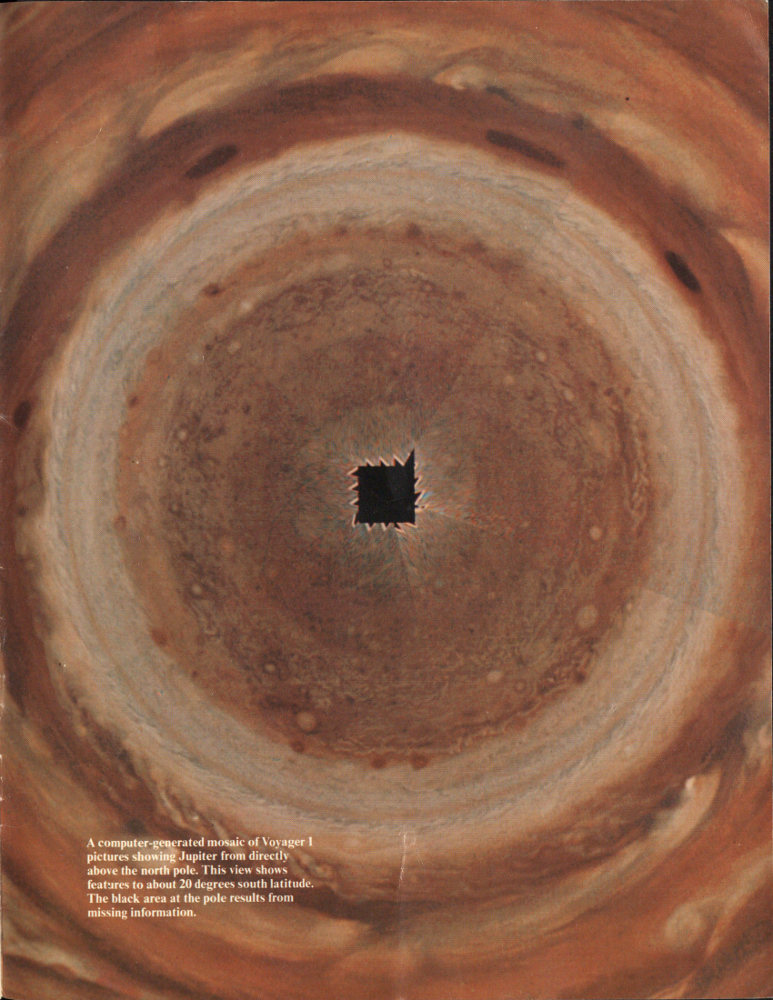 A computer-generated mosaic of Voyager 1 pictures showing Jupiter from directly below the south pole. This view shows features as far north as 20 degrees latitude. The black area at the Pole results from missing information.