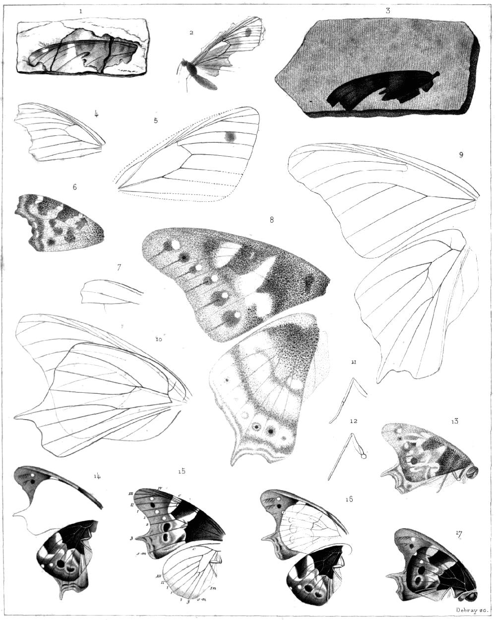 The happy discovery in the Museum of Marseilles of a new fossil butterfly first drew my special attention to this group of extinct insects, and determined me to make, during my residence in Europe, a careful study of the original types of all that had been previously described. By the great courtesy of Count Saporta, Professor Heer, Dr. Reynès, Mr. Oustalet, Mr. Woodward, the Rev. Mr. Brodie, Mr. Charlesworth, and the authorities of the Jermyn street Museum, I was able to study not only all the originals of the Museums of Aix, Marseilles, Zurich, Paris, London, Cambridge and Warwick, but several new types, described here for the first time. As I was unable to visit Vienna, Mr. Brunner de Wattenwyl was good enough to procure for me new drawings, made under his immediate supervision, of the species from Radoboj, described by Heer and preserved in the museums of that city. So that I have either personally inspected all the fossils described within recent times as butterflies, or have procured new and excellent original drawings of them, with the exception of Heer’s Vanessa attavina (Sphinx atava Charp.), which I was unable to find, and two fragments of slight value, viz.: the hind wing referred by Heer to his Vanessa Pluto, and the portion of a hind wing, called Cyllonium Hewitsonianum by Westwood. In the hope of drawing attention to fossil butterflies, which have been hitherto so little studied, I have brought together in this connection all that has been published of this group of fossils, whether of text or illustration; presenting thus, within a small compass, a complete account of our knowledge of these insects, as a basis for future investigations.