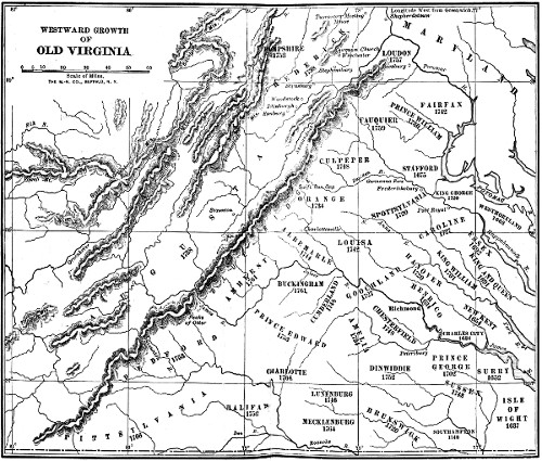 Some significant history is fossilized in the names of Virginia counties. When they are not the old shire names imported from England, like those just mentioned, they are apt to be personal names indicating the times when the counties were 7 first settled, or when they acquired a distinct existence as counties. For a long time such personal names were chiefly taken from the royal household. Thus, while Charles City County bears the name of Charles I., bestowed upon the region before that king ascended the throne, the portion of it south of James River, set off in 1702 as Prince George County, was named for George of Denmark, consort of Queen Anne. So King William County on the south bank of the Mattapony, and King and Queen County on its north bank, carry us straight to the times of William and Mary, and indicate the position of the frontier in the days of Charles II.; while to the west of them the names of Hanover and the two Hanoverian princesses, Caroline and Louisa, carry us on to the days of the first two Georges.2 At the time with which our narrative 8 is now concerned, all that region to the south of Spottsylvania was unbroken wilderness. In 1670 a careful estimate was made of the number of Indians comprised within the immediate neighbourhood of the colony, and there were counted up 725 warriors, of whom more than 400 were on the Appomattox and Pamunkey frontiers, and nearly 200 between the Potomac and Rappahannock.