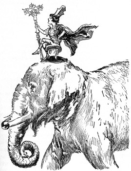 "An elephant, a flying elephant!" panted Chunum, dragging Samuel from under the immense shadow. "Flatten yourself in the sand, seaman, and we may yet be spared." As Samuel, more amazed than scared at so strange and curious a specimen, and even vaguely hopeful of capturing the unwieldy creature, made no move, Chunum dragged him down by main force. The elephant meanwhile lighted like some gigantic butterfly on the edge of the cliff. Fairly bleating with fright and terror, the nine Ozamandarins watched him swooping toward them with a sinister and soundless speed. Just behind his ear perched Boglodore, the Old Man of the Jungle, looking cruel and ugly as the genie of all evil.