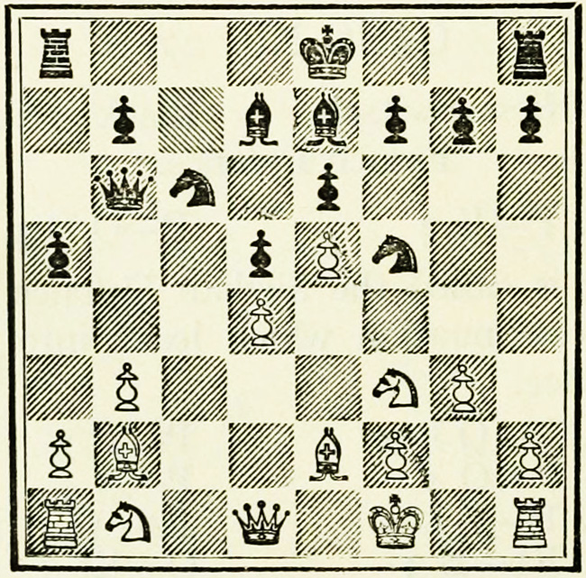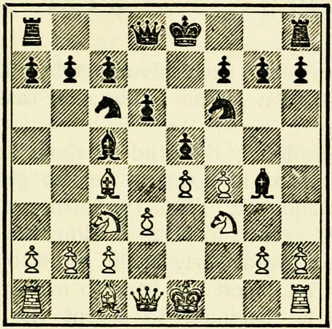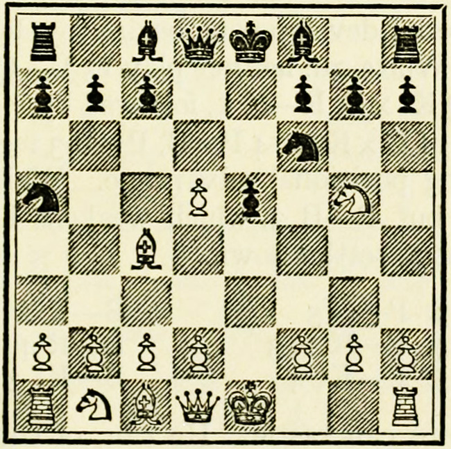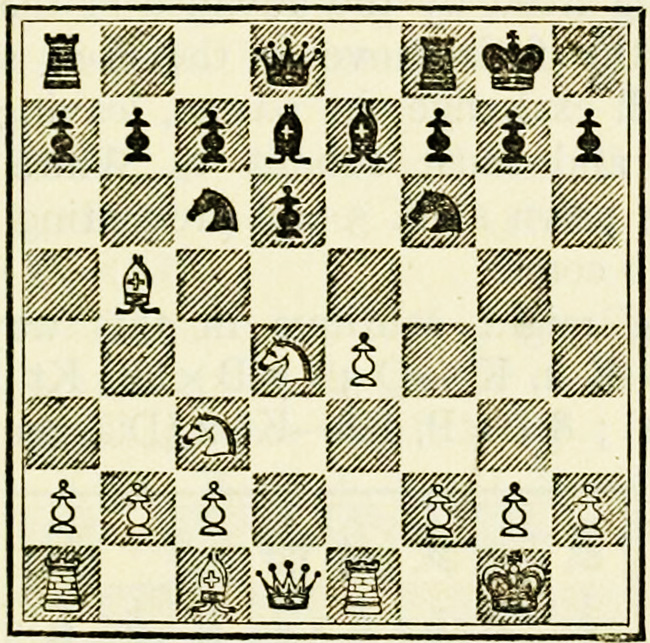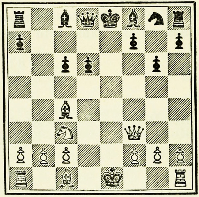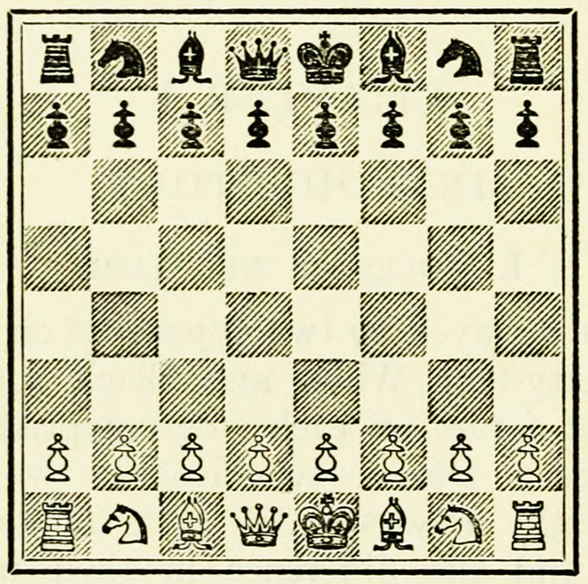 A special notation has been adopted to make the study of games and positions possible, and it is necessary for students of the game to become thoroughly conversant with it. The original and earliest notation is still in use in English, French, and Spanish speaking countries. It is derived from the original position in the game, in that the squares take the names of the pieces which occupy them. Thus the corner squares are called R 1 (Rook’s square or Rook’s first), and to distinguish them from one another QR1 or KR 1 (Queen’s or King’s Rook’s square). The squares immediately in front are called QR2 or KR2. A distinction is made between White and Black, and White’s R 1 is Black’s R 8, Black’s R 2 is White’s R 7, White’s K B 3 is Black’s KB6, and so on. K stands for King; Q for Queen; B for Bishop; Kt for Knight; R for Rook; and P for Pawn. In describing a capture, only the capturing and the captured pieces are mentioned, and not the squares.