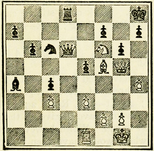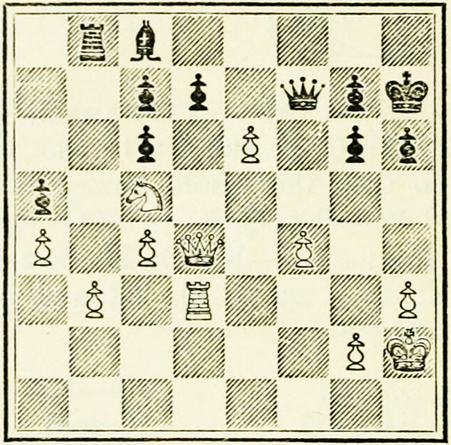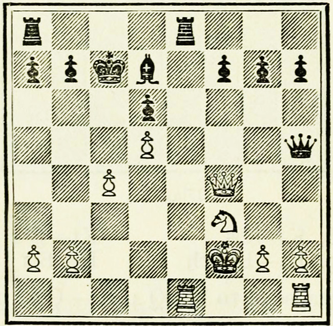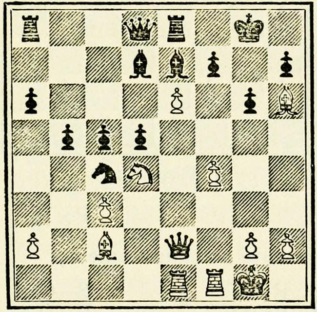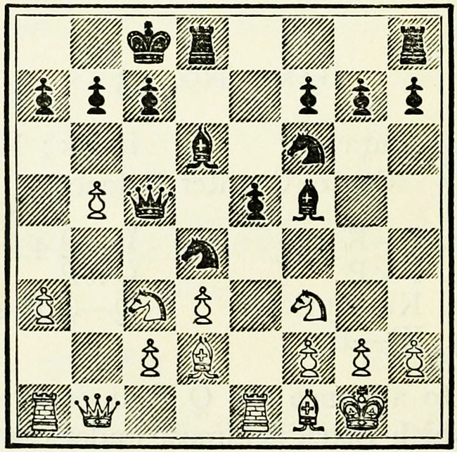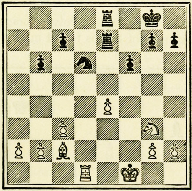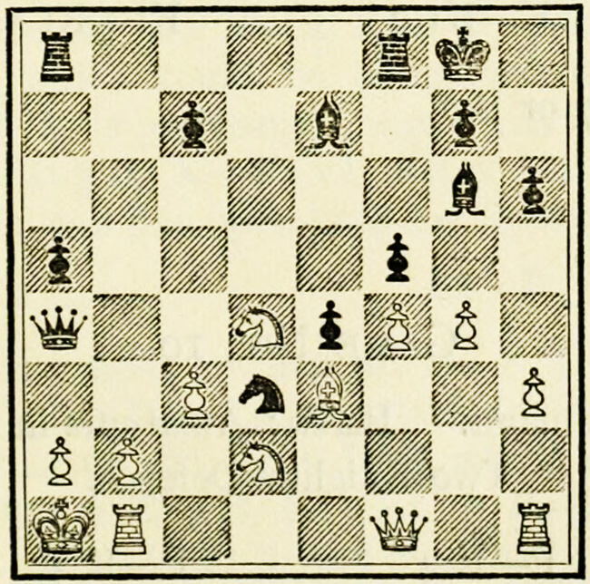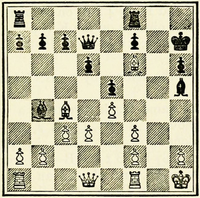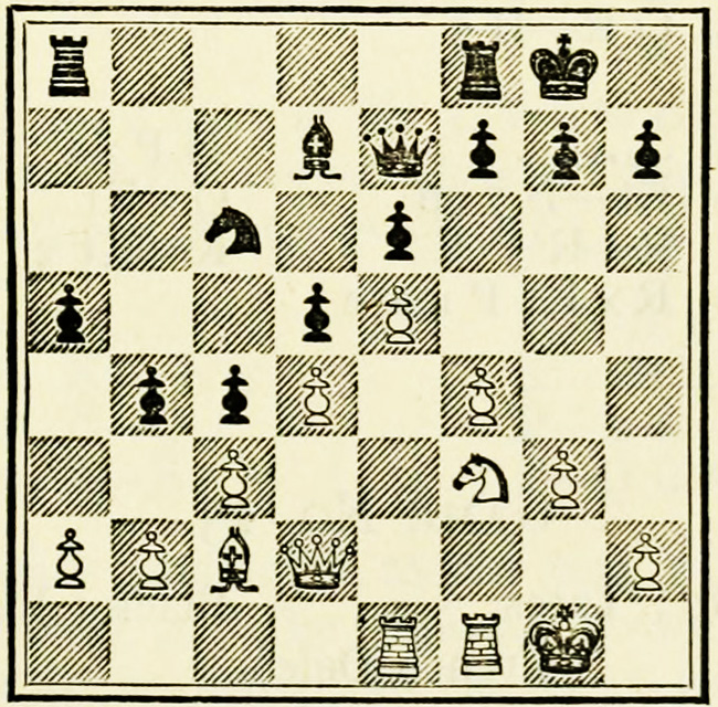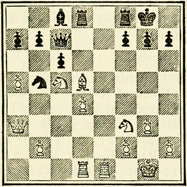White’s counter attack on the King’s side becomes threatening, and Black must continue his operations on the Queen’s wing with the greatest care, as he may be called upon at any time to concentrate his pieces for the defence of the King’s wing.