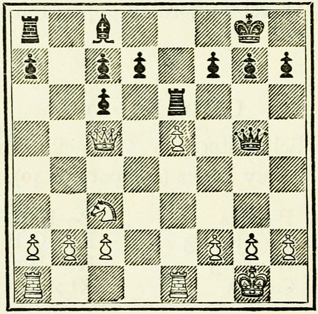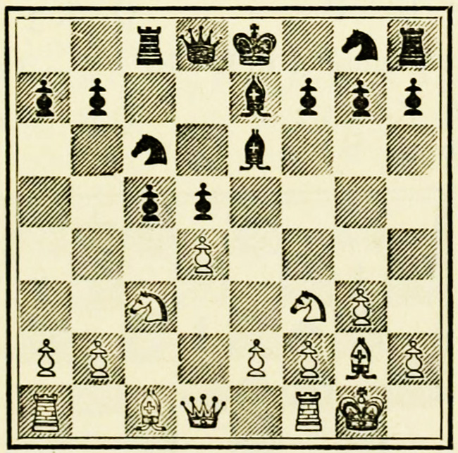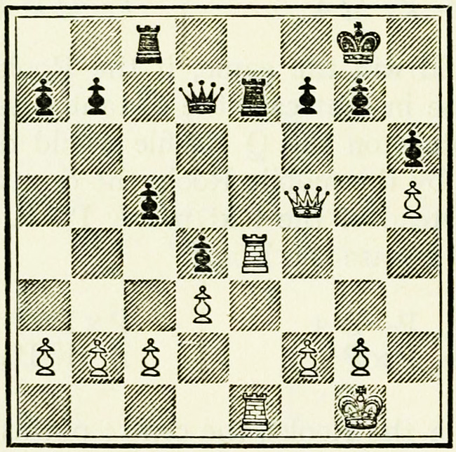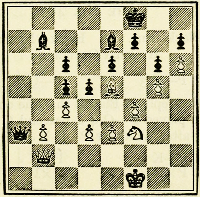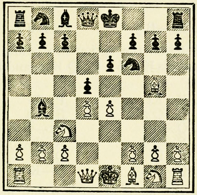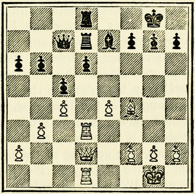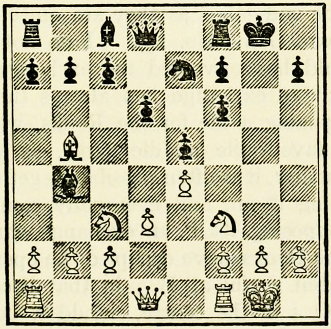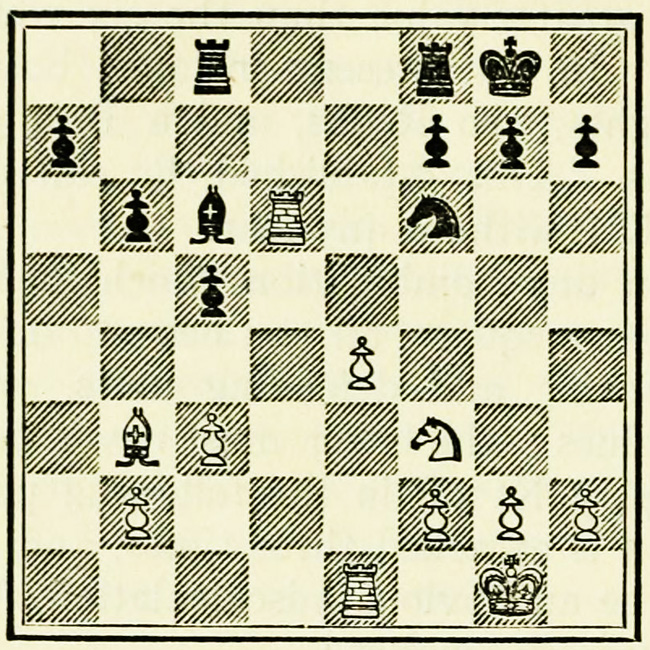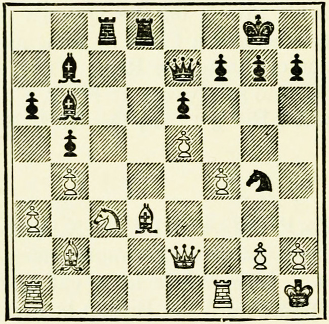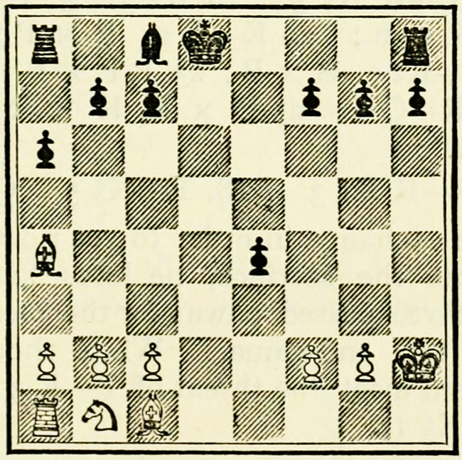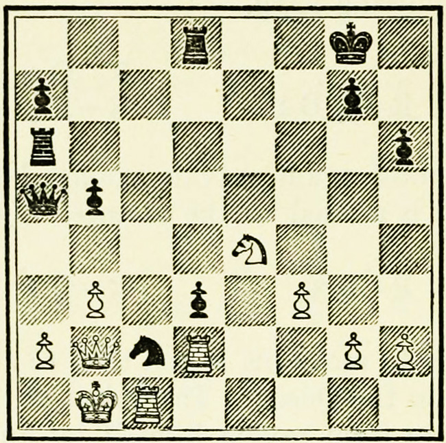 White’s counter attack on the King’s side becomes threatening, and Black must continue his operations on the Queen’s wing with the greatest care, as he may be called upon at any time to concentrate his pieces for the defence of the King’s wing.