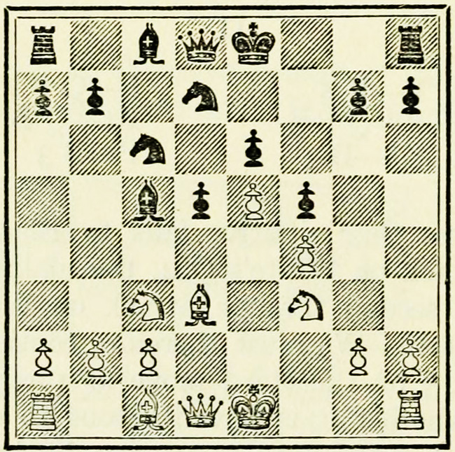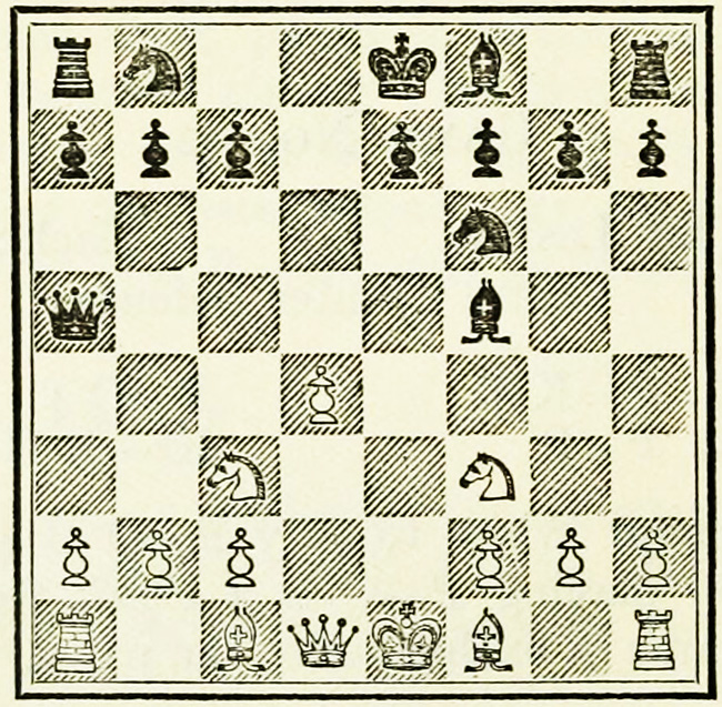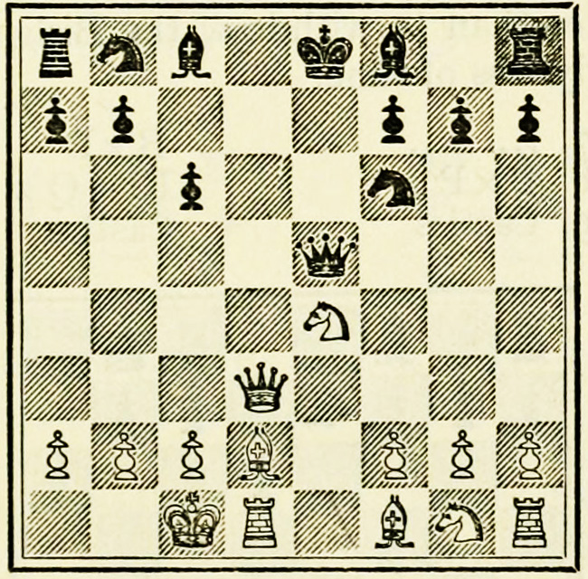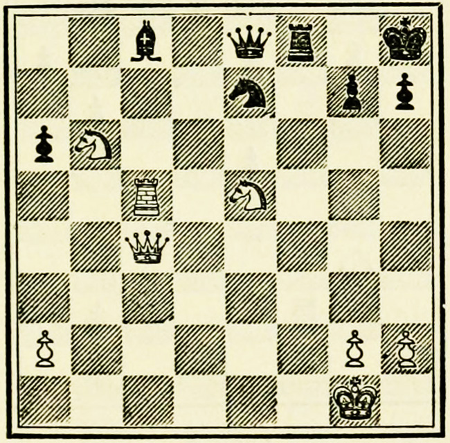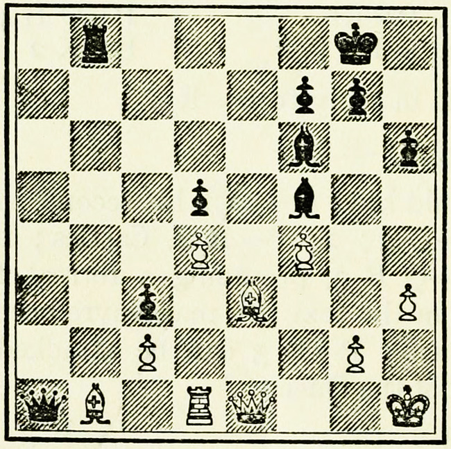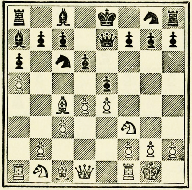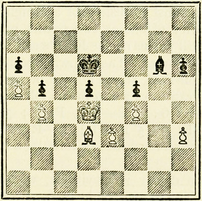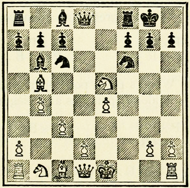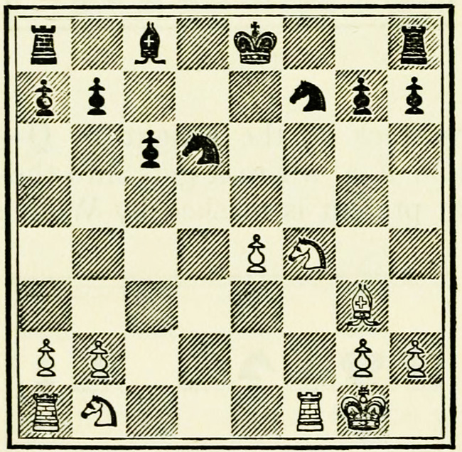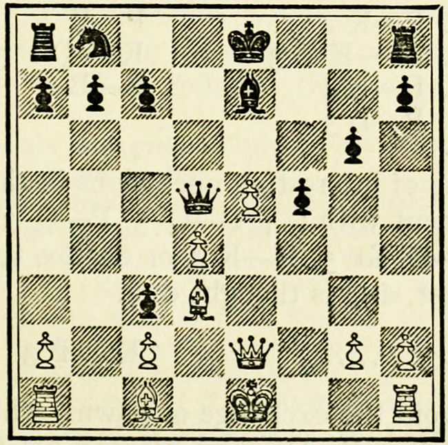 White’s counter attack on the King’s side becomes threatening, and Black must continue his operations on the Queen’s wing with the greatest care, as he may be called upon at any time to concentrate his pieces for the defence of the King’s wing.