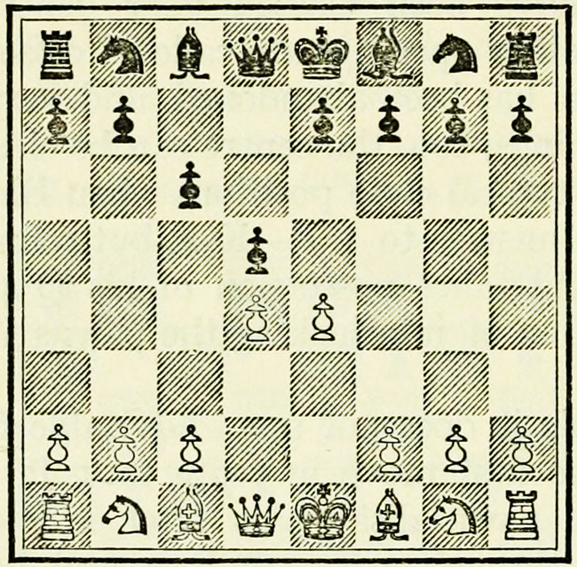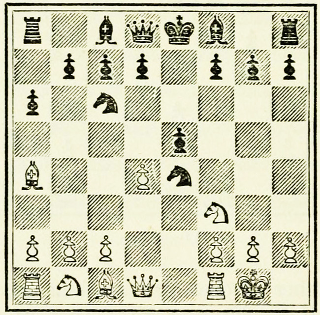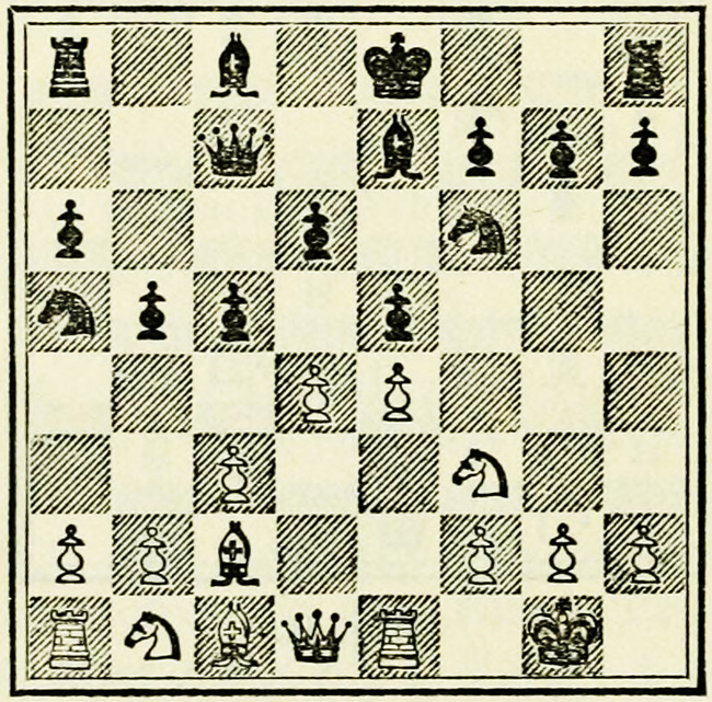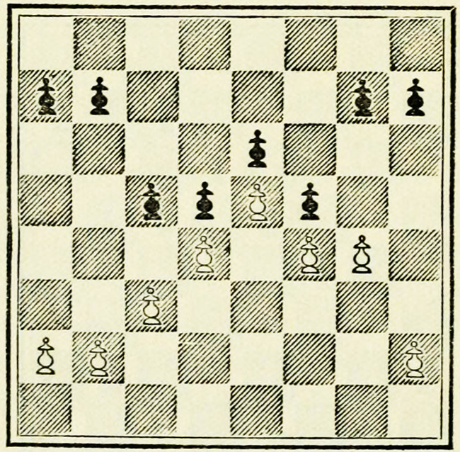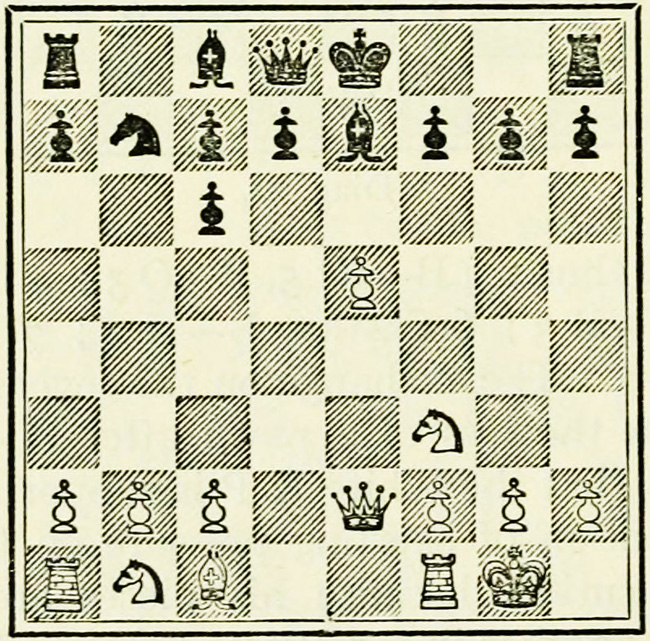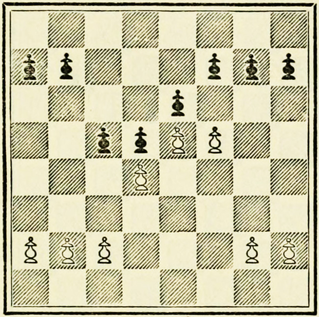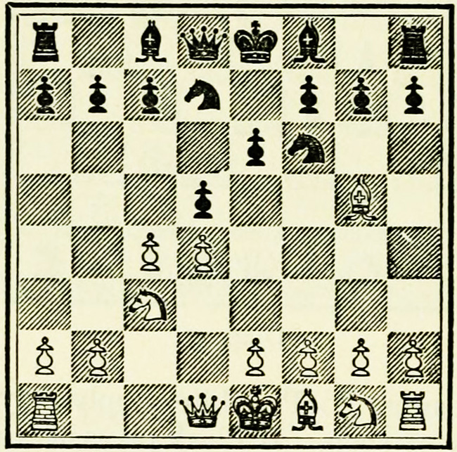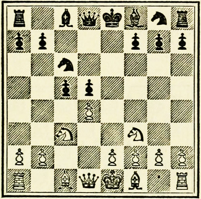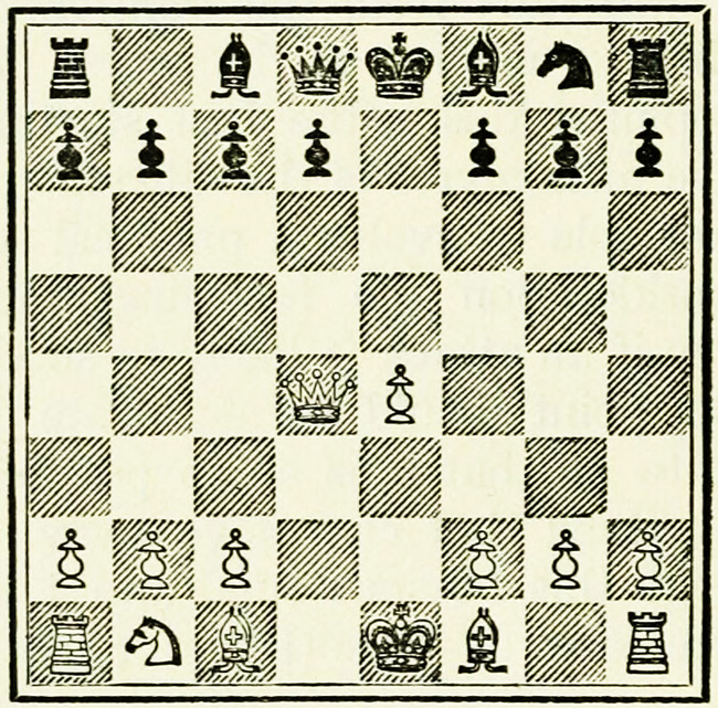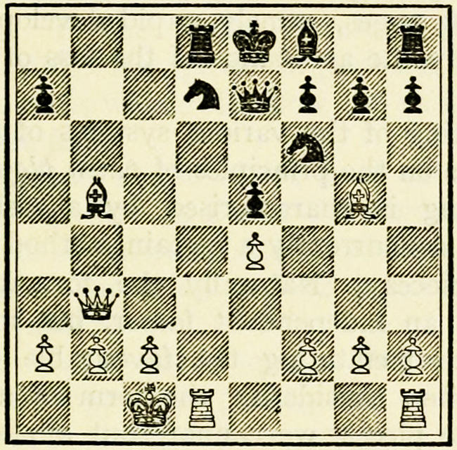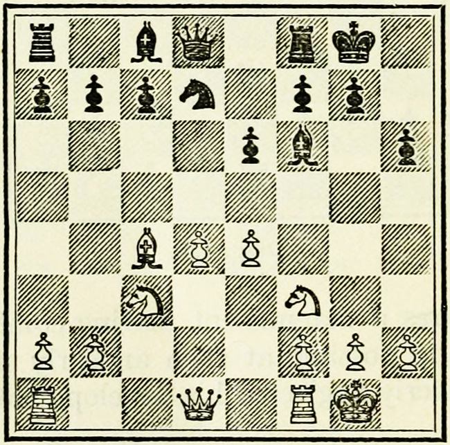It is Black’s move, and we will suppose he wishes to play P-K4. A beginner will probably calculate thus: I push on my pawn, he takes with his pawn, my Knight takes, so does his, then my Bishop takes, and so on. This is quite wrong, and means waste of time and energy.