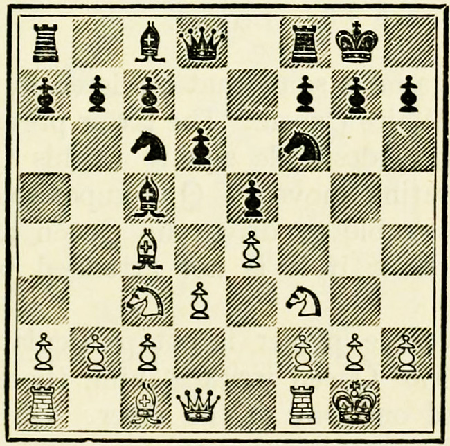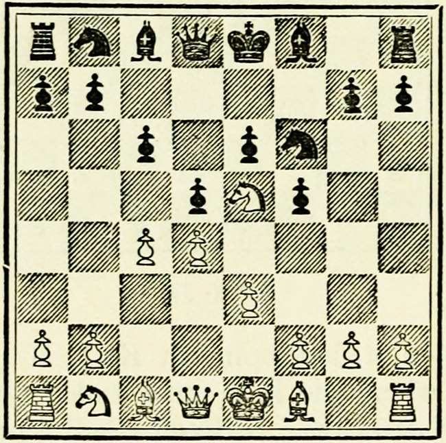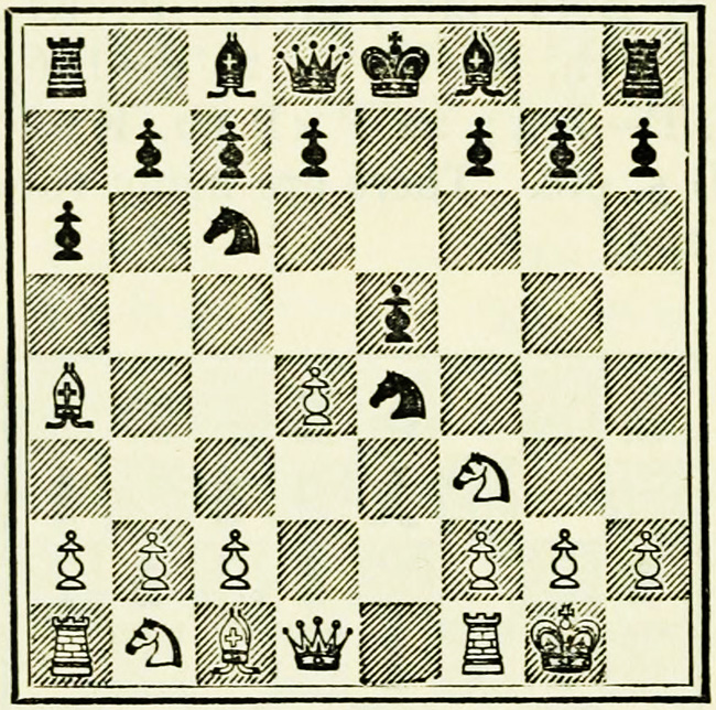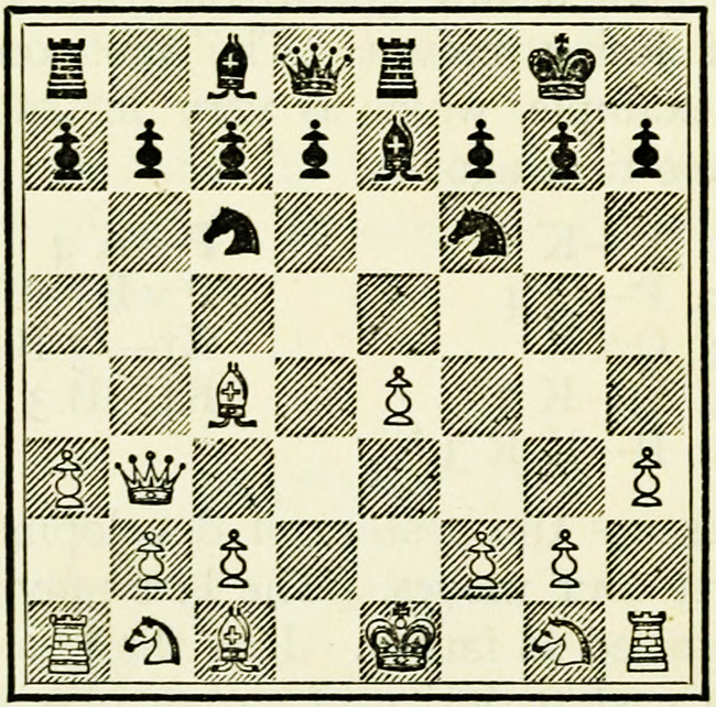 As was seen on a former occasion, it is a shade better to develop the Knights before the Bishops, as the choice of moves for the latter is less limited. The alternative might have been 5. Kt-B3, B-KKt5; 6. B-K2, Kt-B3.