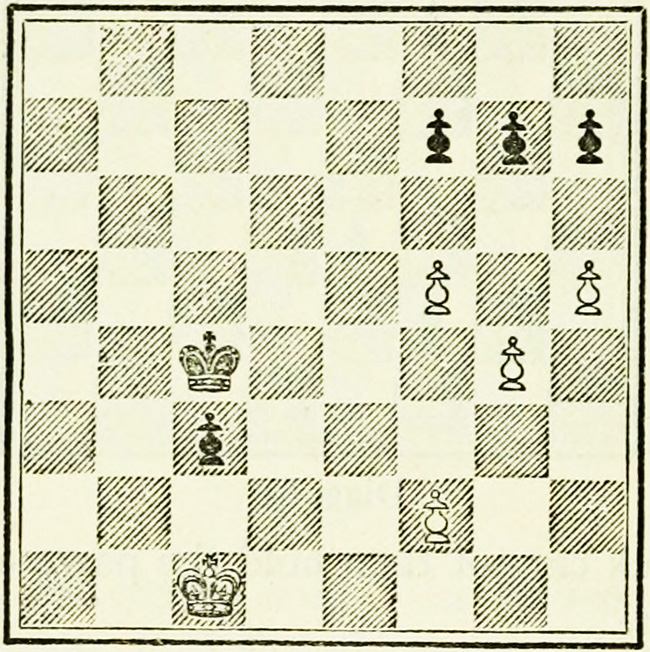The end-game is a clear win for White. He plays his Kt to KKt4, threatening to reach B6 or K5. The effect is twofold.
