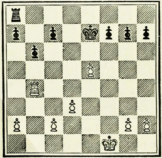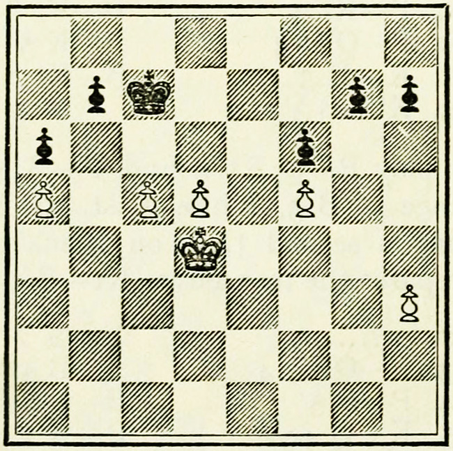 Black must keep his B at K2 and his K must remain near the KBP. White’s King marches to QKt6 and captures the QB pawns, queening his QKtP. Black cannot prevent the White King from doing this by B-Q1, as White, by attacking Black’s QB4 with his B, could at any time force the B back to his K2. The remainder of the game needs no comment.