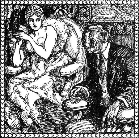 „Nun, Sie —“ die Göttliche nieste zum dritten Male und zuckte mit unnachahmlicher Grazie die Achseln, „dafür bin ich auch immer gnädig gegen Sie gewesen und besuche Sie sogar von Zeit zu Zeit, obwohl ich mich jedesmal trotz meines vielen Pelzwerks[S. 9] rasch erkälte. Erinnern Sie sich noch, wie wir uns das erste Mal trafen?“