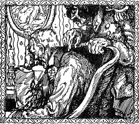 Sie saß im Fauteuil und hatte ein prasselndes Feuer angefacht, dessen Widerschein in roten Flammen ihr bleiches Antlitz mit den weißen Augen[S. 8] leckte und von Zeit zu Zeit ihre Füße, wenn sie dieselben zu wärmen suchte.