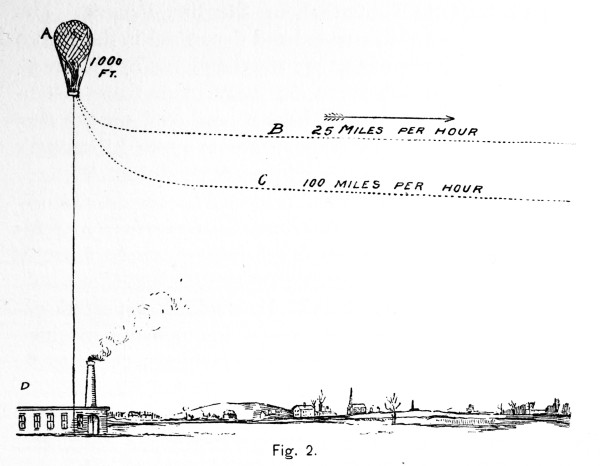 In Fig. 2 A represents a captive balloon at a height of one thousand feet. B and C represent the courses which would be taken by dirigible aeroplanes or soaring machines bearing loads of freight.
