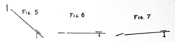 To any one who desires to take up this most fascinating study, Figs. 3 and 4 will give a general idea as to the construction of his first instrument for making experiments. A represents a backbone five-eighths of an inch square and four feet long, made of pine wood; B, the main aeroplane, eight inches wide and three feet long. This should be made of light tin plate, and bent in the middle so as to form a flattened V; the angle should be about one hundred and seventy degrees. C represents a steering aeroplane six inches by twenty-four inches, pivoted at cc, also made of light tin plate; D, a vertical aeroplane four inches by twenty inches, rigidly fixed in the wooden backbone; E, a rod of steel wire, eighteen or twenty inches long, and carrying an adjustable leaden weight of three ounces; K, a rod two and one-half inches long, soldered in the centre of and vertical to the plane C, with a pivot at the upper end with which the rod MM is connected. This rod should have five or six pivot-holes at its forward end N, so that its working length may be varied for different experiments; J, a rod pivoted at G, free to swing fore and aft; N, a pivot where the rod MM joins the rod J; F, a leaden weight adjustable higher or lower upon the rod J; its proper weight is x, an unknown quantity. Upon ascertaining by repeated experiment the right weight for F, the right position for the adjustable weight E, and the right length for the rod MM, the reaching of the maximum efficiency of a system of aeroplanes largely depends. I think that this sets forth with clearness the problem as it stands to-day. When it is fully solved—and it certainly seems solvable—right and left steering will be a less difficult matter, and alighting will be accomplished by killing the momentum when near the ground by an abrupt upward slant of the main aeroplanes; but this is an anticipation and a digression. Now to return to the instrument we are considering: this soaring machine is intended to gain velocity by a swoop, and then automatically steer itself into a horizontal or very slightly descending course, as indicated by B and C in Fig. 2. It depends upon the principle[18] that the pendulum rod always seeks the perpendicular; for instance, when the machine is launched pointing steeply downward, the positions of the pendulum and aeroplanes are as shown in Fig. 5; therefore the steering aeroplane C will, as soon as velocity is gained, lay a strong hold upon the wind of flight, and have a tendency to bring the machine into a horizontal course. Now, if the length of the rod MM is made correct by adjustment at the pivot-holes near N, when the desired course, a very gentle decline, is reached, both aeroplanes will be approximately horizontal, as shown in Fig. 6. If, however, the machine deviates either upward or downward from its intended course, the weight at the end of the pendulum causes the steering aeroplane to correct the error. Fig. 7 shows the effect of a slight upward deviation.