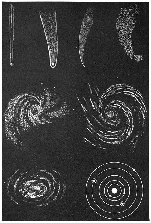 Typical stages in development of a solar system. (Reproduced from nature. See Chapter XIII.)—1. Newton’s comet, A.D. 1680. 2. Comet of 1811, from Guillemin. 3. Donati’s comet, 1858, from Proctor. 4. Nebula in ship Argo, from Flammarion. 5. Open spiral nebula in Virgo, Plate XV., Nichol’s “Architecture of the Heavens,” after Lord Rosse. 6. Plate XII. of same work, nebula in Canes Venatici: a partially closed spiral. 7. Frontispiece of same, an almost completed spiral, in the Lion, seen obliquely: rupture of convolutions preparatory to formation of planets. 8. Ideal solar system.