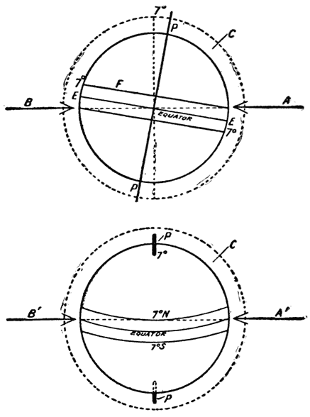 | Figs. 21 and 22. | Complex lines of planetary electrical action upon the sun produced by the inclination of the solar axis to the plane of the ecliptic | 120 | ||||||