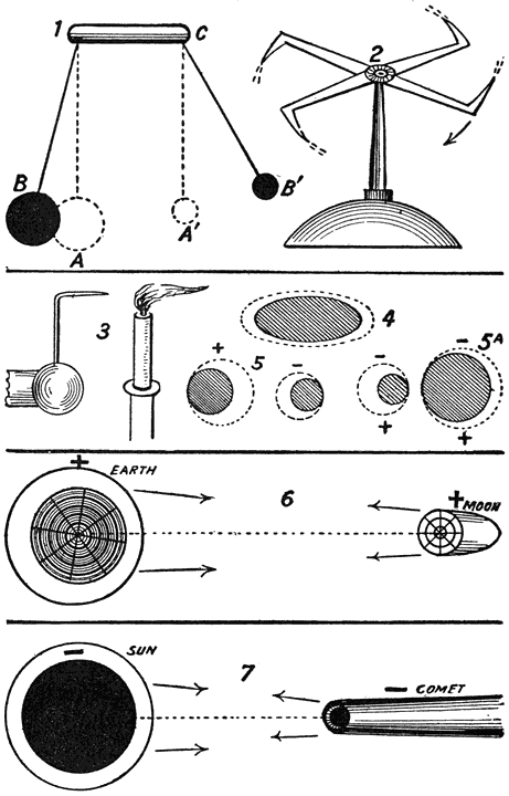 | Figs. 23 to 29. | Examples of electrical repulsion: Fig. 1, similarly electrified pith-balls; Fig. 2, the electrical windmill; Fig. 3, repulsion of a flame; Fig. 4, self-repulsion around a conductor; Fig. 5, attraction between opposite and repulsion between similar electricities; Fig. 6, mutual repulsion between similar + electrospheres of the earth and the moon; Fig. 7, mutual repulsion between the similar—electrospheres of sun and comet | 124 | ||||||