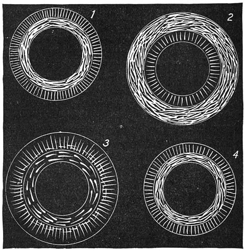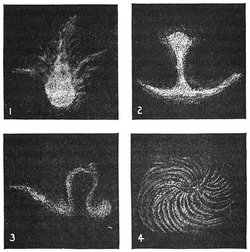 | Figs. 56 to 59. | Four gaseous nebulæ in process of development into solar systems: Fig. 1, divergent spiral; Fig. 2, later stage of a similar spiral; Fig. 3, subsequent stage of rupture of the nearly circular convolutions of a similar nebula; Fig. 4, the same stage in the development of a solar system with a double sun | 279 | ||||||