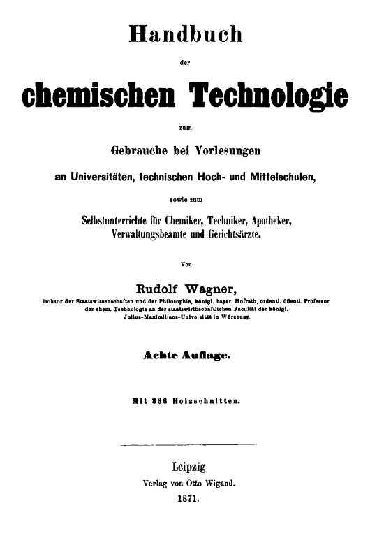 Die erste Auflage des vorliegenden Buches, die ich als Privatdocent der chemischen Technologie in der philosophischen Facultät der Hochschule zu Leipzig herausgab, erschien im September 1850. Die beiden nächsten Auflagen, von denen die zweite im Mai 1853 und die dritte im Juli 1856 versendet wurden, bearbeitete ich von Nürnberg aus, wo ich vier Jahre als Professor der technischen Chemie an der königl. Gewerbeschule wirkte. Die nächsten fünf Auflagen, von denen