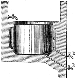 Anstatt die Luft unmittelbar zu erwärmen, bedient man sich zuweilen eines Zwischenträgers, nämlich des Wassers, welches sich seiner hohen specifischen Wärme wegen ganz besonders dazu eignet. Die darauf basirte Heizung nennt man die Heisswasserheizung[200]. Es kommt dabei darauf an, ein mit heissem Wasser angefülltes Gefäss in den zu heizenden Raum zu bringen und Sorge zu tragen, dass die Wärme, die das Wasser verliert, wieder ersetzt wird. Man unterscheidet die gewöhnliche Warmwasserheizung oder Niederdruckheizung, bei welcher das Wasser niemals über seinen Siedepunkt hinaus erhitzt wird, von der eigentlichen Heisswasserheizung oder Hochdruckheizung, von welcher weiter unten die Rede sein wird.