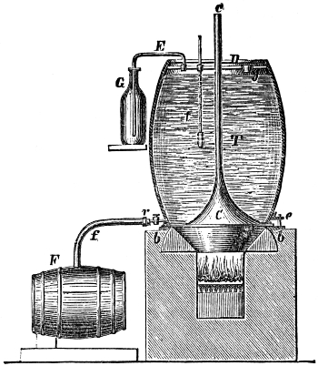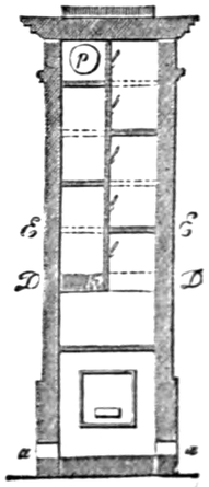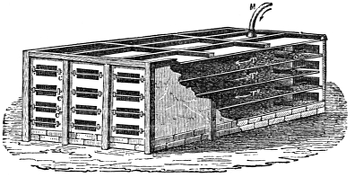 In der neueren Zeit noch hat ein Apparat von Beaumont und Mayer, um mittelst der Reibung Wärme zu erzeugen, Aufsehen erregt. Dieser Apparat hat den Zweck, ausserdem verlorene Kräfte, wie z. B. unbenutzte Wassergefälle, Winde etc., dadurch zu verwerthen, dass durch Reibung einer konischen hölzernen Welle in einem Metallstücke mit entsprechender konischer Aushöhlung im Innern eines zum Theil mit Wasser gefüllten Dampfkessels Dampf erzeugt wird. Es ist nach dem Gesetze der Erhaltung der Kraft einleuchtend, dass der durch diesen Apparat gelieferte Dampf nie als Triebkraft benutzt werden kann, da man schon einer solchen bedarf, um den Apparat in Bewegung zu setzen und daher die von dem Apparate selbst erzeugte Kraft nothwendig geringer sein muss als die ursprüngliche[203]. Ein anderer Apparat, der ohne Anwendung von Brennmaterial[822] Wärme verbreitet, beruht auf der Wärmeentwickelung durch die Compression der Luft mit Hülfe einer Verdichtungspumpe. Derselbe ist von Arzbecher zu Heizungszwecken vorgeschlagen worden. Zur Bewegung der Luftpumpe könnte irgend eine mechanische Kraft, welche eine Nebennutzung gestattet, verwendet werden. Aber auch hier ist nicht zu vergessen, dass die producirte Wärme nur umgesetzte Kraft (= Arbeit) ist. (Da einer Wärmeeinheit ein mechanisches Aequivalent von 424 Kilogr. entspricht, so müsste eine Pferdekraft 10 Stunden thätig sein, um eine Wirkung zu erzeugen, die 1 Kilogr. Steinkohle entspricht.) Die Wärme, welche bei der Gährung von Stalldünger sich entwickelt, findet bei der Erwärmung von Gewächshäusern praktische Anwendung. An der hohlen Wand derselben wird ein etwa 2 Meter hoher Düngerhaufen, welcher mit abgefallenem Laube etc. vermengt ist, aufgeschichtet, indem man durch den unteren Theil desselben einige an beiden Enden offene Röhren von Blech, etwas geneigt, einlegt. Diese Röhren erwärmen sich und die Luft circulirt in denselben und tritt an dem einen Ende erwärmt aus.