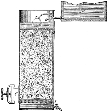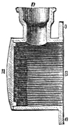 a) Bei der Niederdruckheizung nach der ersten Methode steht ein grosser Wasserkessel, welcher dicht zugeschraubt werden kann, mit Röhren in Verbindung, welche nach den zu heizenden Räumen führen und dann wieder in den Kessel zurückkehren. Das Princip der Circulation des Wassers wird aus Fig. 334 deutlich werden. Die Erwärmung des Wassers geschieht in dem Kessel A, e ist das Steigrohr, d f die zum Kessel zurückgehende Heizröhre. Das Gefäss e dient zum Füllen des Apparates mit Wasser; es entweicht ferner durch dasselbe die Luft, die sich beim Erwärmen aus dem Wasser entwickelt, ferner die Wasserdämpfe, welche durch zu starkes Heizen des Kessels sich bilden könnten. Indem das Wasser in dem Steigrohr emporsteigt und dabei seine Wärme den darüber befindlichen Flüssigkeitstheilchen mittheilt, fliesst kaltes Wasser aus f f in den Kessel herab, erwärmt sich daselbst und steigt in die Höhe. Dieses Spiel dauert so lange, als noch in den verschiedenen Theilen ein Temperaturunterschied vorhanden ist; es wird aber niemals aufhören, wenn das aufsteigende warme Wasser unterwegs abgekühlt und der Temperaturunterschied forterhalten wird. Ein kleiner Wasserverlust findet dabei statt, so dass man von Zeit zu Zeit durch die mit einem Stopfer verschlossene Oeffnung e am oberen Theil der Röhre etwas Wasser nachfüllen muss. Die Leitungsröhren werden am besten aus Gusseisen angefertigt. Man rechnet bei dieser Heizung[820] 20–30 Quadratfuss Heizfläche auf je 100 Kubikfuss Zimmerraum. Zur Abgabe der Wärme an die Luft der zu heizenden Räume bedient sich die Warmwasserheizung sogenannter Oefen. Die gebräuchlichste Form derselben ist die Säule; sie besteht aus einem senkrechten Cylinder von 2 bis 3 Meter Höhe und 0,3–0,7 Meter Durchmesser, welcher parallel mit seiner Axe eine Anzahl der Luft zugängliche Röhren enthält. Die Warmwasserheizung, die sich in vielen öffentlichen und Privathäusern Leipzigs, Berlins und anderer Städte Deutschlands eingebürgert hat, ist eine äusserst comfortable Heizmethode. Gleichmässige, leicht regulirbare Wärme, Vermeidung allen Rauches, Staubes und Geruchs, vollkommene Gefahrlosigkeit, täglich einmaliges Feuern fern von den zu erwärmenden Räumen, geringer Kostenaufwand, leichte Anbringung der erforderlichen Ventilation — das sind die grossen Vorzüge der Warmwasserheizung vor allen Heizarten.