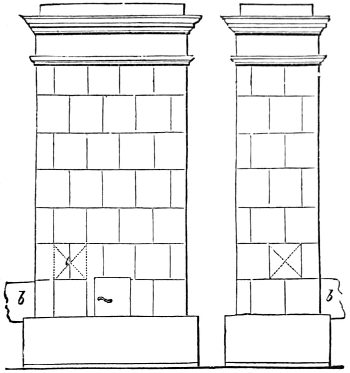 | a) | Die äussere kalte Luft tritt in den Heizraum und strömt als erwärmte Luft durch einen Kanal in den zu heizenden Raum; ein der eintretenden Luft gleiches Volumen Zimmerluft strömt durch die Fenster- und Thürfugen aus. |