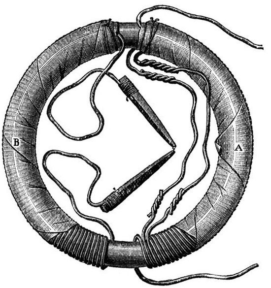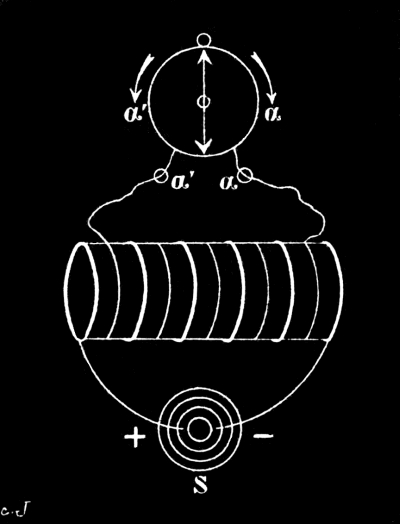 The induction apparatus of Faraday in its simplicity was in a certain measure the embryo out of which all dynamos and transformers have developed. We have seen how the first induction current was discovered by making and breaking the current from a battery in the primary coil. This method was at first adhered to, until Faraday remarked that when the secondary was quickly drawn out of or put into the primary coil, induced currents were also produced without requiring to break the circuit, the wires of the secondary coil cutting the lines of force in the magnetic field of the primary coil. He then replaced the primary coil and battery by a permanent magnet, which was likewise dipped into the induction coil, Fig. 3.