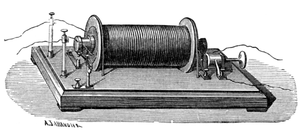 In order to give some idea of the magnitude of the electro-magnetic forces which came into play here, suffice it to say, that the exciting coils could hold suspended in the air in their interior an iron core weighing 520 kg. The primary or magnetising coil was of square copper wire, with a side measuring ¼ inch, and a battery of 50 to 100 Grove elements was employed, the immersed area of the surface of the plates being 100 square inches. This apparatus gave sparks of great length. When, with maximum currrent strength, the primary circuit was broken, sparks of 8 inch length were received.