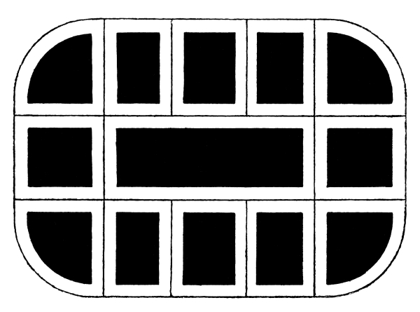 [32] There were two such apparatus as shown in Fig. 18, which were connected in series, and excited with 13 ampères from a Siemens’ alternating current dynamo. The apparatus had the following construction:—The induction coils, a section of one of which is shown in Fig. 19, had three layers of primary wire, and the secondary was wound in four divisions, the ends of the wires of the divisions being led to a commutator. Fig. 20 shows this commutator placed in the middle of four induction coils. The ends of the secondary wires were connected to eight terminals on the upper plate of the apparatus, from which the current could be led away from each pair, or combined at will. By aid of the commutator, the number of coils in circuit could be altered as desired. On the lower plate there was a second commutator, which served the same purpose for the primary circuit.
