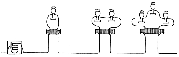 [27] When, however, the term high electromotive force is met with in descriptions of the apparatus of that time, it must be taken to mean a great difference of potential between the terminals of the dynamo, not between the primary terminals of the transformers. Take, for instance, 100 transformers connected in series, run with a difference of potential at the dynamo of 1000 volts, although it was not known at that time how to produce so high an electromotive force, still this would give across the primary terminals of each transformer the modest difference of potential of 10 volts. In this way the difference of potential at the generator was determined by the number of transformers in series. This system had plainly the great disadvantage, that no matter how tortuous a path the lead must follow, it had to pass through the primary coils of all the transformers, and the principles of a proper system of distribution were not present.