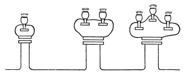With the invention of the glow lamp quite other aims were placed in the foreground for the electrical world. The incandescent lamp did not possess that unsteadiness of light which, with arc lamps, gave so much trouble to electricians. The prominent qualities of the glow lamp offered opportunity for the solution of a problem, such as gas had already solved half-a-century earlier, namely, the distribution of the electric light, or, more properly, of the electric current. For this, the already known and generally employed methods of connection were no longer sufficient. Edison was the first who demonstrated that the series method of connection was not suitable for glow lamps; at the same time he showed the advantages of parallel connection, coming forward with a thoroughly well thought and worked out system of distribution. By this means the change was made, and, from this time onward, all inventors were obliged to suit their systems to the demand, that each point of consumption must remain undisturbed by the variations of current which take place in the circuit. [29]