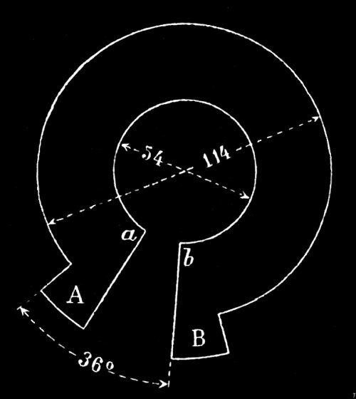 The arrangement, as in Fig. 2, made by Faraday showed itself to be an especially effective combination for the production of these induction phenomena. There were wound round an iron ring two separate wires of about the same length. The one coil was brought into connection with a [ 4] battery, and to the ends of the other a pair of electrodes were attached. The current from the battery being sent through the primary coil, lines of force were produced which ran almost altogether in the iron core. As the core possessed only a very small magnetic resistance, the intensity of magnetisation was very great, and on closing the primary circuit a strong inductive effect on the secondary coil was produced. Faraday obtained with this apparatus the first sparks of induction. The apparatus is all the more interesting as, although not completely without poles, it at least forms a closed magnetic circuit. It has much likeness to the non-polar transformer of Zipernowsky, Déri, and Bláthy, but it may be easily shown to be not entirely poleless. Poles mean, in electrical as well as magnetic circuits, those points between which the greatest difference of potential exists. A current without difference of potential can only flow in an electrical or magnetic circuit when the loss of potential in each part of the length of the circuit, viz., the product of resistance and current, is equal to the gain of potential, that is the magneto-or electromotive force; therefore a current without difference of potential requires that the resistance and magneto-or electromotive force in each part of the length be the same. Now the magnetic resistance of a symmetrical iron ring is constant in all parts of the length of its magnetic circuit. In the case in question only one half of the ring was excited, therefore poles must have been formed at both ends of the exciting coil. The [ 5] ratio of transformation of this apparatus of Faraday’s was equal to unity, so it had therefore no claim to the designation of “transformer.”