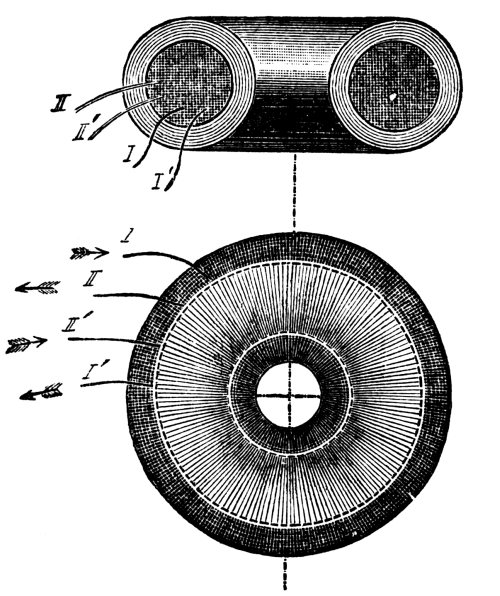 If indeed earlier inventors proposed for other purposes magnetically-closed induction coils, the fame due to the birth of proper non-polar transformers, in which the whole of the primary and secondary turns have a like position relatively to the magnetic-field, first invented, carried out, and combined into a self-regulating system of current distribution, belongs undoubtedly to Messrs. Zipernowsky, Déri, and Bláthy.