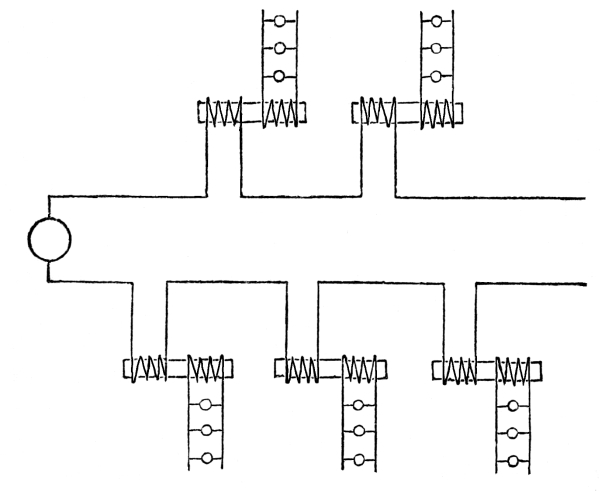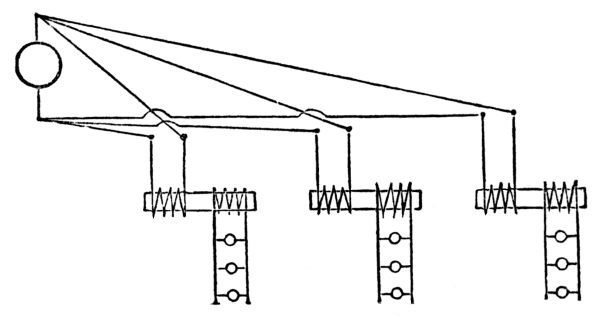 It was, therefore, in the year 1885 that the problem of current distribution by means of transformers was solved in a truly practical manner. The ideas which led the inventors to this thoroughly successful solution were then so unknown to practical and theoretical electricians, that it was long ere they were understood and appreciated. Even in February, 1886, such an electrician as Prof. Forbes maintained in his Cantor Lectures that the parallel connection of transformers was quite impracticable. He believed, namely, that a connection such as shown in Fig. 29 was useless, because the difference of potential at the generator diminished from the machine outwards, but that a connection such as shown in Fig. 30 must be used. According to [56] him, in a direct system of distribution each lamp should have a separate lead, and having regard to the great number of leads which would thus be necessary, he concluded that the series method of connection was the right one. One would suppose that Prof. Forbes was not aware of the weighty disadvantages of this method. However, that was not the case. He proposed, that with series connection the strength of current should be kept constant, and that each transformer should have an especial regulating apparatus—the raising or lowering of the core; which, by the way, is an arrangement impracticable in a well designed transformer. Such a regulating apparatus has lately been made automatic.